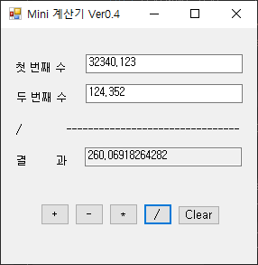 | using System; using System.Collections.Generic; using System.ComponentModel; using System.Data; using System.Drawing; using System.Linq; using System.Text; using System.Threading.Tasks; using System.Windows.Forms; namespace WindowsFormsApplication1 { public enum Arithmetic { plus, minus, multiple, division } public partial class Form1 : Form { public Form1() { InitializeComponent(); this.Clear(); } private double GetNum(string str) { double returnValue = 0; if(string.IsNullOrEmpty(str)) { MessageBox.Show("공백 입니다, 숫자를 입력하세요"); this.Clear(); throw new Exception("공백 입니다, 숫자를 입력하세요"); } try { returnValue = double.Parse(str); } catch { MessageBox.Show("숫자를 입력하세요"); this.Clear(); throw new Exception("숫자를 입력하세요"); } return returnValue; } private double GetNum1() { return GetNum(this.textNum1.Text); } private double GetNum2() { return GetNum(this.textNum2.Text); } private void btnAdd_Click(object sender, EventArgs e) { double num1 = GetNum1(); double num2 = GetNum2(); double num = Operate(num1, num2, Arithmetic.plus); this.textResult.Text = num.ToString(); this.lbResult.Text = "+"; } private void btnMinus_Click(object sender, EventArgs e) { double num1 = GetNum1(); double num2 = GetNum2(); double num = Operate(num1, num2, Arithmetic.minus); this.textResult.Text = num.ToString(); this.lbResult.Text = "-"; } private void btnMul_Click(object sender, EventArgs e) { double num1 = GetNum1(); double num2 = GetNum2(); double num = Operate(num1, num2, Arithmetic.multiple); this.textResult.Text = num.ToString(); this.lbResult.Text = "*"; } private void btnDivision_Click(object sender, EventArgs e) { double num1 = GetNum1(); double num2 = GetNum2(); double num = Operate(num1, num2, Arithmetic.division); this.textResult.Text = num.ToString(); this.lbResult.Text = "/"; } private void btnClear_Click(object sender, EventArgs e) { this.Clear(); } private void Clear() { this.textNum1.Text = ""; this.textNum2.Text = ""; this.textResult.Text = ""; this.lbResult.Text = "Ready"; } private double Operate(double num1, double num2, Arithmetic ari) { double returnValue = 0.0; switch(ari) { case Arithmetic.plus: returnValue = num1 + num2; break; case Arithmetic.minus: returnValue = num1 - num2; break; case Arithmetic.multiple: returnValue = num1 * num2; break; case Arithmetic.division: returnValue = num1 / num2; break; } return returnValue; } } } |