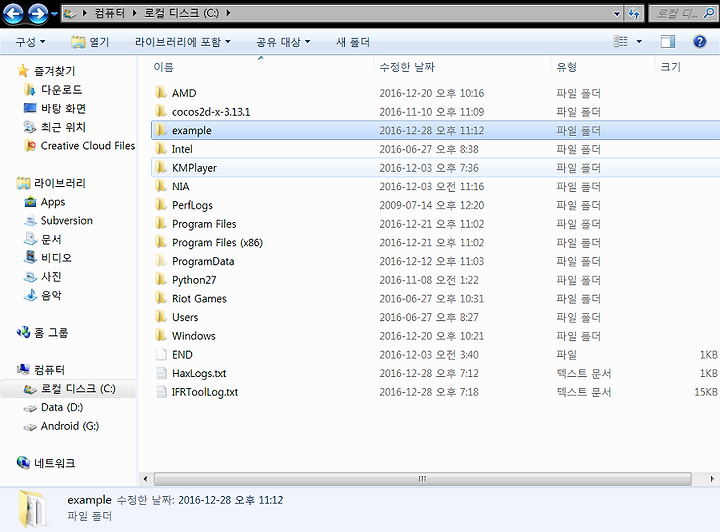 c:\\example 폴더를 만들어 줍니다.