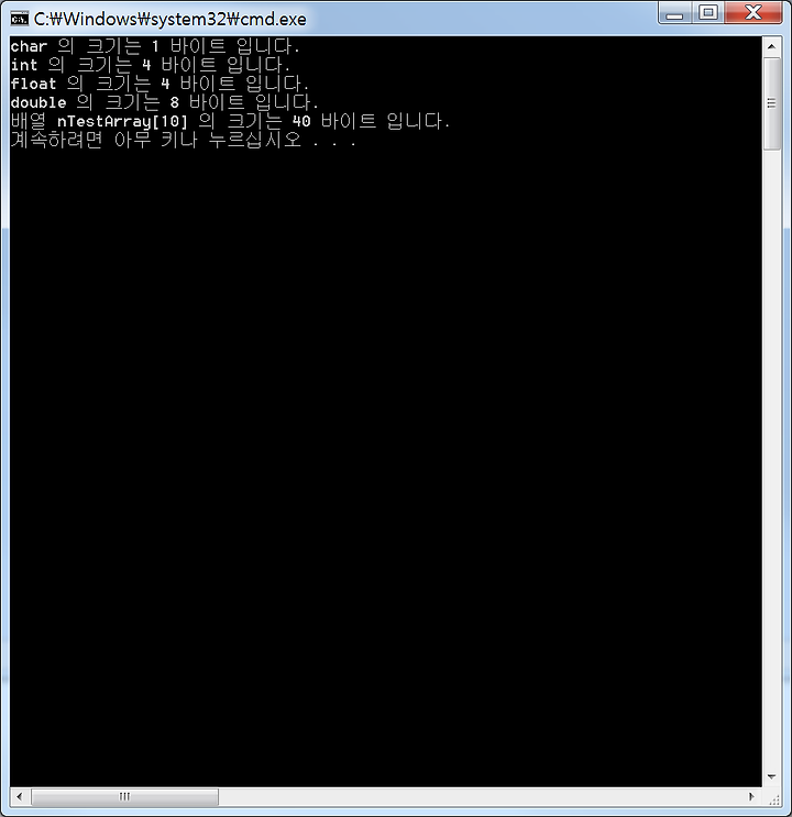 printf("배열 nTestArray[10] 의 크기는 %d 바이트 입니다. \n",nArraySize);