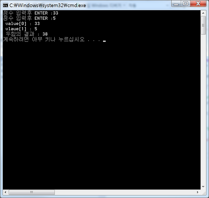 printf(" value[0] : %d\n vlaue[1] : %d\n 두합의 결과 : %d \n", value[0], value[1], value[0] + value[1]);